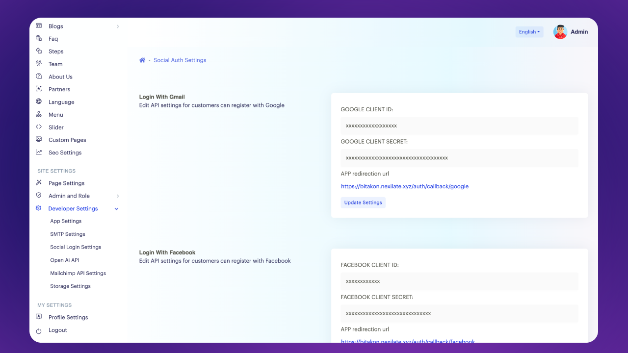 Or click to Developer Settings > Social Login Settings option from admin sidebar